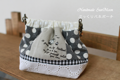 マチ付きのぷっくりとした形のバネポーチです。その他ベビー雑貨やブックカバーなど掲載しています。